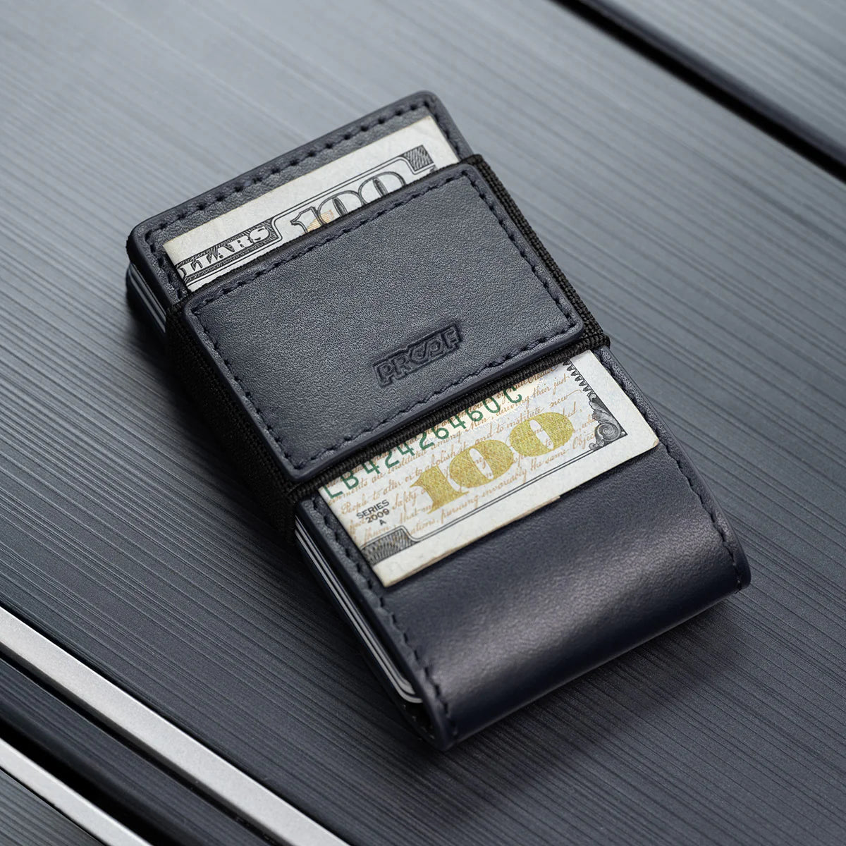 The PROOF Wallet incorporates fine full grain leather and aerospace metals into a sleek, ultra functional minimalist design. It allows carrying up to 25 cards safely and securely with built in RFID Blocking internal materials. We've topped it off with a snug cash strap on the back and an intuitive pull strap on the front for easy card access.